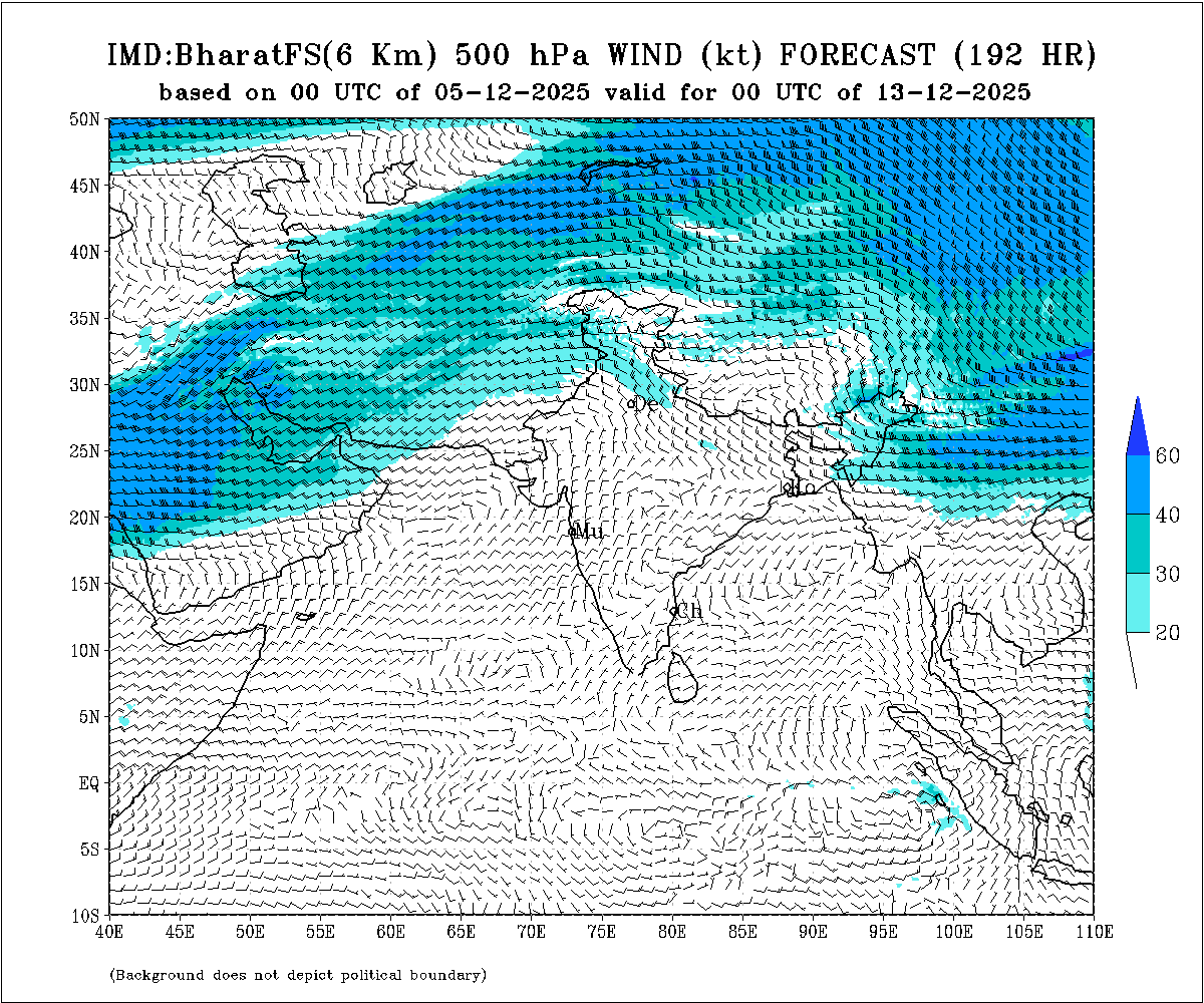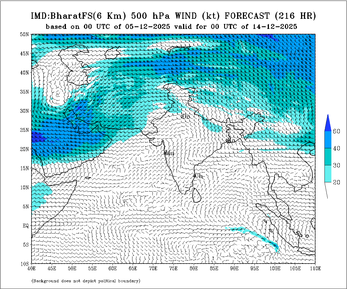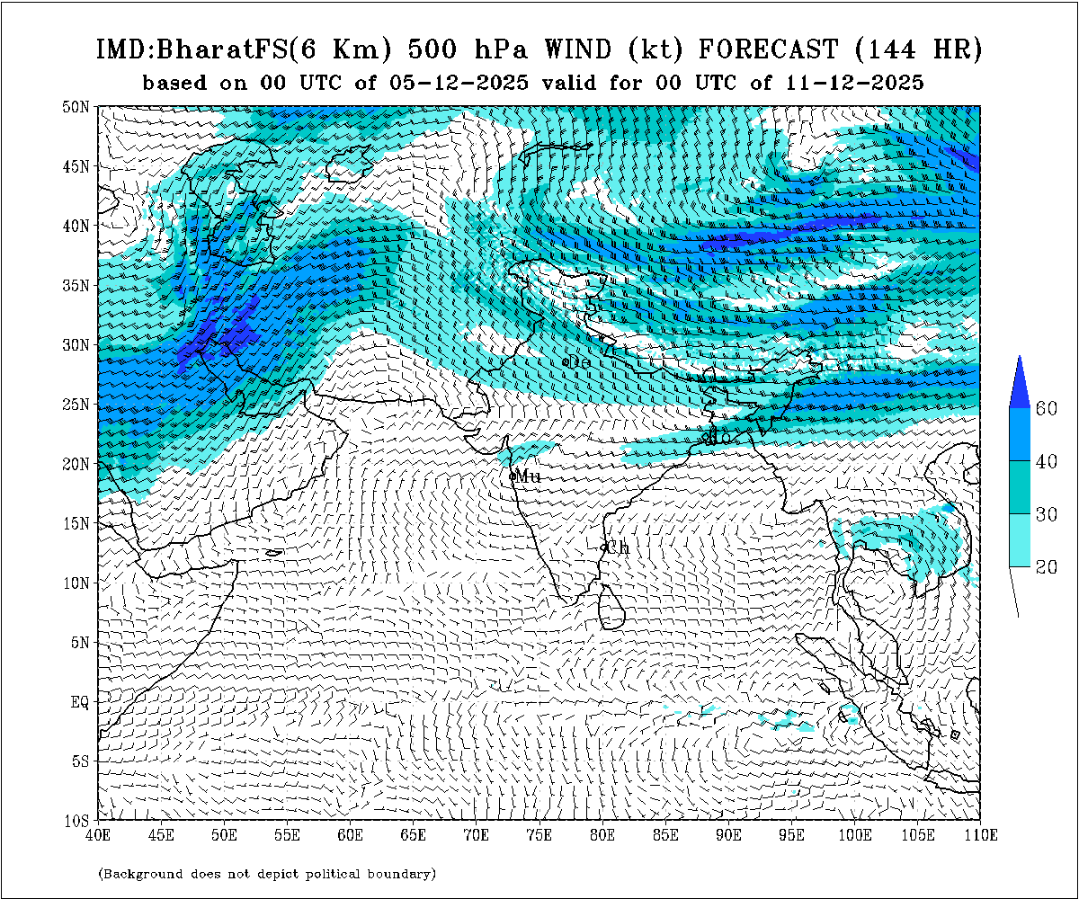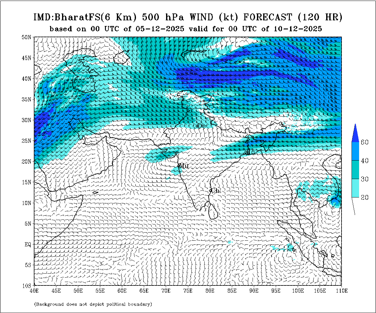 નોંધ: ચાર્ટ માં એક કોઠો આપેલ છે જેમાં વિવિદ્ધ કલર પવનો ની સ્પીડ સી લેવલ થી 5.8 km ની ઉંચાઇએ નોટ માં દર્શાવે છે. 1 નોટ = 1.852 કિમી/કલાક