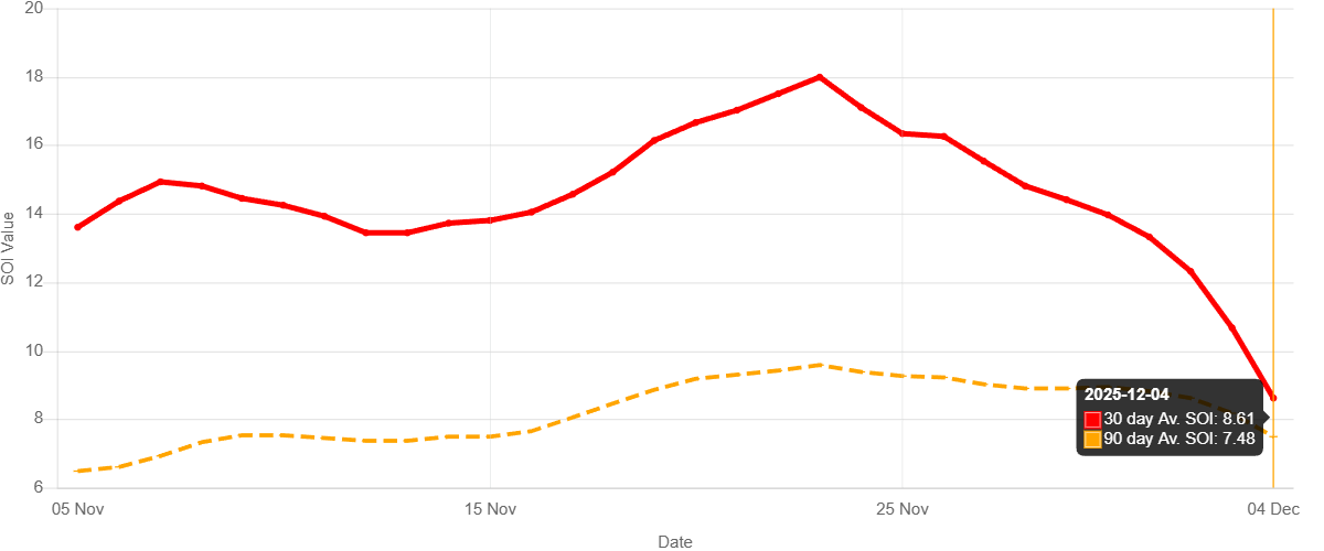 30 Days average SOI was +13.95 at the end of November 2025 and was +8.61 on 4th December 2025 as per The Long Paddock – Queensland Government and 90 Days average SOI was +7.48 on 4th December 2025. The monthly values are in positive zone.