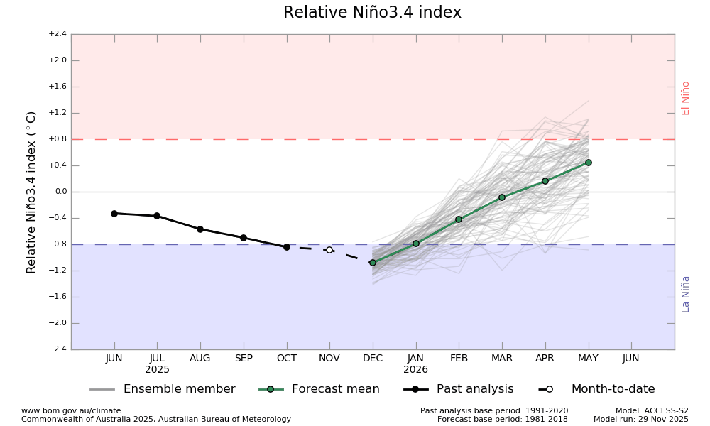 Hence, the current La Nina thresh hold will be revisited in January 2026 when the new climatological base period 1996-2025 will be adopted. See details